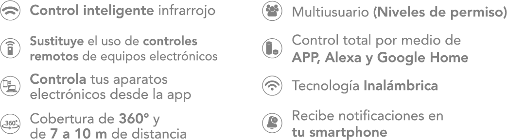 Aplicación: Con el control de infrarrojos inteligente, sustituye el uso de controles remotos y con tu celular maneja varios equipos unificando el uso a través de un solo mando.
